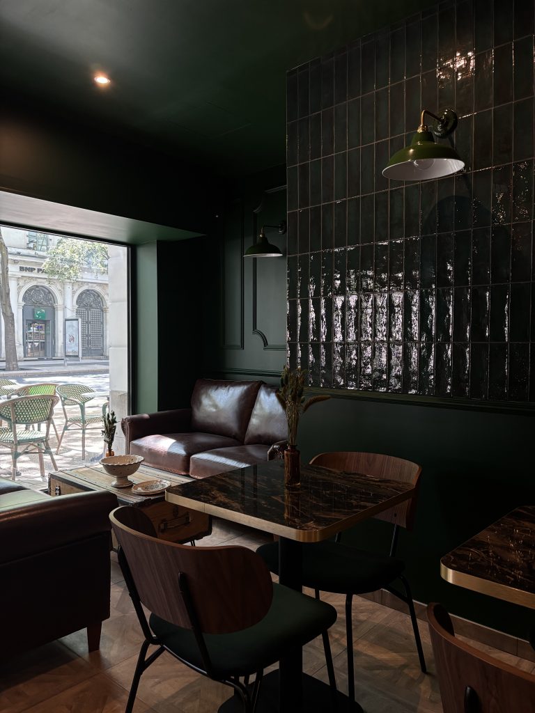 L’intérieur (ainsi que l’identité visuelle) conçu par Carlacota Design, plonge les visiteurs dans une esthétique raffinée et intemporelle : les murs vert foncé intense habillent l’espace, le bar sur mesure, sculpté, effet noyer, pièce centrale, impose sa présence élégante et chaleureuse. Face à lui, un ancien piano Rameau, soigneusement remis en état, attend de reprendre la parole, note après note. Autour, tout invite à la lenteur et à la dégustation : chaises en bois foncé et velours vert, canapé Chesterfield, tables effet marbre, des zelliges vert profond qui captent la lumière comme un miroir discret. Chaque détail raconte une vision : celle d’un lieu où l’on prend le temps, où l’on savoure, où l’on murmure. Whisper, c’est un bar à cocktails, mais aussi une expérience spatiale, une parenthèse hors du temps,où l’architecture intérieure sublime l’art du silence et celui du goût.
